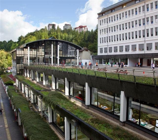 Du fait de la topographie de la vallée de Morez, le choix du site pour implanter cette grande école n’est pas aisé. Aussi, Guadet imagine-t-il d’élever cinq corps de bâtiments étagés sur la pente de la ville : un grand internat tout en haut, un corps d’externat parallèle un peu plus bas, une galerie de circulation perpendiculaire qui les relie et descend jusqu’au quai Lamy grâce à un impressionnant escalier (240 marches).